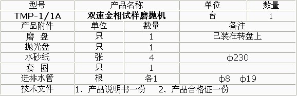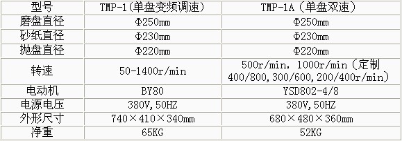 產(chǎn)品概述: TMP-1單盤雙速金相試樣磨拋機(jī) •澳大利亞科學(xué)家smeuls提出凡是用固定磨料(如砂輪片、砂輪和金剛石磨盤以及各種砂紙)制備試樣的過程稱為磨光,凡是使用松散磨料(如加入各種磨料微粉懸浮液、噴霧拋光劑、拋光膏)制備過程稱為拋光。 •單盤雙速磨拋機(jī)(拋盤、研磨盤)就能完成各種試樣的粗磨、細(xì)磨、干磨、濕磨、研磨及拋光等各道工序。 •該機(jī)的磨拋盤直徑均大于國內(nèi)同類產(chǎn)品,有效增加工作面20-30%有更多不同線速度的選擇。 •本機(jī)可選擇安裝PD-1型推移器,,能替代手工進(jìn)行磨拋各道工序。 TMP-1A無級(jí)變速金相試樣磨拋機(jī) •變頻調(diào)速,試驗(yàn)范圍自行設(shè)定。 •只需調(diào)換磨盤或拋盤和選擇合適轉(zhuǎn)速即可粗磨、細(xì)磨、干磨、濕磨、研磨及拋光等各道工序。 •傳動(dòng)功率、磨拋盤直徑均大于國內(nèi)同類產(chǎn)品,,可增加有效工作面20-30%,,可適應(yīng)不同材料的制備要求。 •本機(jī)可選擇安裝PD-1型推移器,能替代手工進(jìn)行磨拋各道工序。 技術(shù)參數(shù):