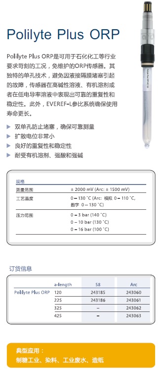 Polilyte Plus ORP是可用于石化化工等行業(yè)要求苛刻的工況,,免維護的ORP傳感器。其獨特的單孔技術(shù),,避免因液接隔膜堵塞引起的故障,,傳感器在高堿性溶液、有機溶劑或者在低電導(dǎo)率溶液中表現(xiàn)出可靠的重復(fù)性和穩(wěn)定性。此外,,EVEREF-L參比系統(tǒng)確保使用壽命更長。