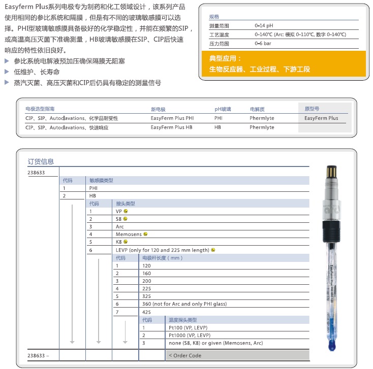 Easyferm Plus系列電極專(zhuān)為制藥和化工領(lǐng)域設(shè)計(jì),,該系列產(chǎn)品使用相同的參比系統(tǒng)和隔膜,,但是有不同的玻璃敏感膜可以選擇。PHI型玻璃敏感膜具備極好的化學(xué)穩(wěn)定性,,并能在頻繁的SIP,,或高溫高壓滅菌下準(zhǔn)確測(cè)量,,HB玻璃敏感膜在SIP、CIP后快速響應(yīng)的特性依舊良好。