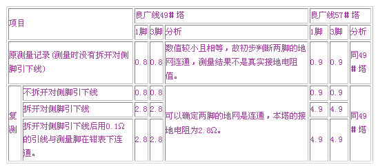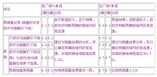我們復(fù)測(cè)了110kV良廣線74#塔北廣線7#塔的接地電阻結(jié)果如表1所示:
