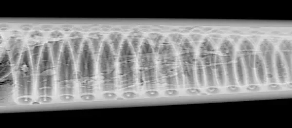 可見利用X射線照相檢測(cè)方法對(duì)該型號(hào)空速管進(jìn)行檢測(cè)不可能實(shí)現(xiàn)對(duì)整圈加熱絲一周焊接狀況的檢測(cè)因?yàn)槊恳淮瓮刚罩荒軝z測(cè)每圈加熱絲與射線束相切部位的這極少的部分。如果要利用X射線照相檢測(cè)方法對(duì)加熱絲整圈焊接狀況進(jìn)行檢測(cè)那么將對(duì)技術(shù)和生產(chǎn)效率帶來極大的挑戰(zhàn)。