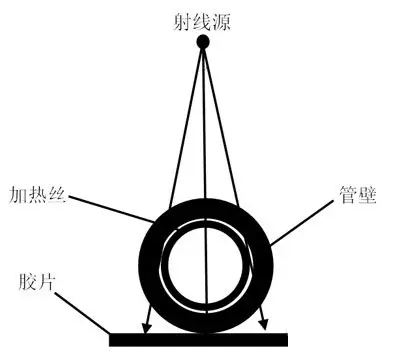 空速管透照示意如圖3所示其中外環(huán)為管壁內(nèi)部圓形線圈及加熱絲加熱絲通過焊料與管壁焊接在一起。因此如果用X射線照相檢測(cè)方法檢查空速管焊接情況那么只有射線與管體內(nèi)壁圓周相切的地方才能被準(zhǔn)確地發(fā)現(xiàn)缺陷。在管體其它部分也會(huì)有黑度的起伏變化但是由于內(nèi)部表面焊料的分布不均勻性和各種粗糙缺陷都會(huì)使底片黑度發(fā)生起伏變化無法判斷是否是加熱器與管壁焊接缺陷。