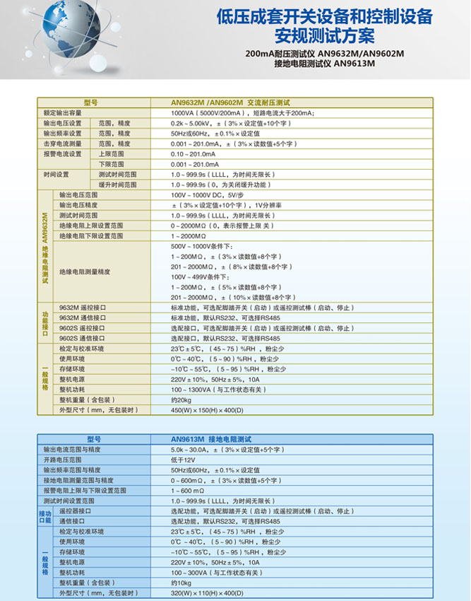 產(chǎn)品概述: 艾諾AN9602M耐壓測試儀具備交流耐壓輸出5000VAC/200mA(持續(xù)時間30分鐘),絕緣電阻測量范圍1~2000MΩ,并能快速準確的完成上述性能指標的測試,精密程控絕緣耐壓測試儀,能滿足各電器、元器件生產(chǎn)廠家和質(zhì)檢部門依照國際和國家安規(guī)標準進行上述安全性能檢測的要求。 AN9632M絕緣耐壓測試儀具備交流耐壓輸出5000VAC/200mA(持續(xù)時間30分鐘),絕緣電阻測量范圍1~2000MΩ,臺灣絕緣耐壓測試儀,并能快速準確的完成上述性能指標的測試,能滿足各電器、元器件生產(chǎn)廠家和質(zhì)檢部門依照國際和國家安規(guī)標準進行上述安全性能檢測的要求。