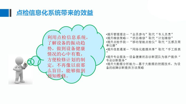 “智能手機(jī)+服務(wù)器”組合取代了“點(diǎn)檢儀+PC端+服務(wù)器”組合,取消了PC端,不僅降低了成本,設(shè)備故障診斷步驟,而且使點(diǎn)檢工作更便捷。