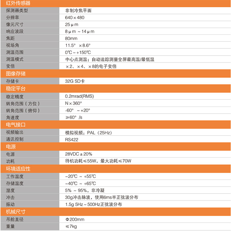 產(chǎn)品特點 體積小重量輕 直徑200mm,紅外熱成像儀價格,重量7kg,大大降低飛機(jī)有效負(fù)荷 640x480高分辨率紅外熱成像儀 分辨率高,可清晰分辨出輸電線路發(fā)熱故障點 跟蹤精度高穩(wěn)定性好 采用陀螺穩(wěn)定平臺,意大利紅外熱像儀,可有效隔離運動載體的各種振動、起伏、 顛簸,醫(yī)學(xué)紅外熱像儀,消除圖像的模糊和晃動 視頻實時回傳 高空視頻可實時回傳至地面指揮中心,紅外熱像儀成像,提高巡線效率 可拍照錄像 配置32G內(nèi)存卡,車載紅外熱像儀,可對觀測點拍照錄像,夜視紅外熱像儀,便于地面對故障進(jìn)行分析 提供標(biāo)準(zhǔn)的通訊接口 標(biāo)準(zhǔn)的通訊接口,方便與無人機(jī)、直升機(jī)等載體通訊,手持式紅外熱像儀,安裝調(diào)試方便