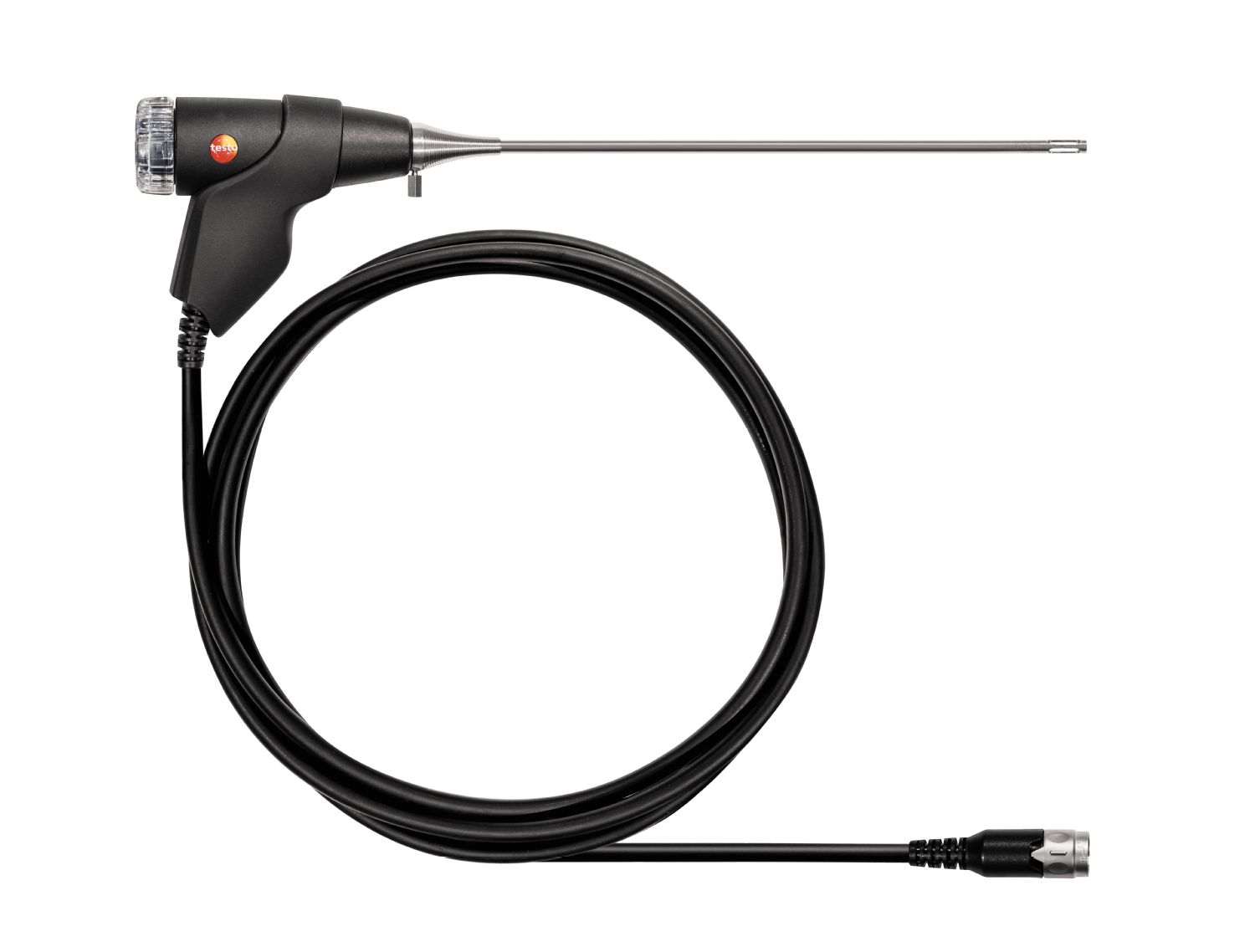 模塊化煙氣探頭帶有長度為 300 mm 的探針套管、圓錐體、耐溫 500 °C 的集成式熱電偶以及快換卡合系統(tǒng)